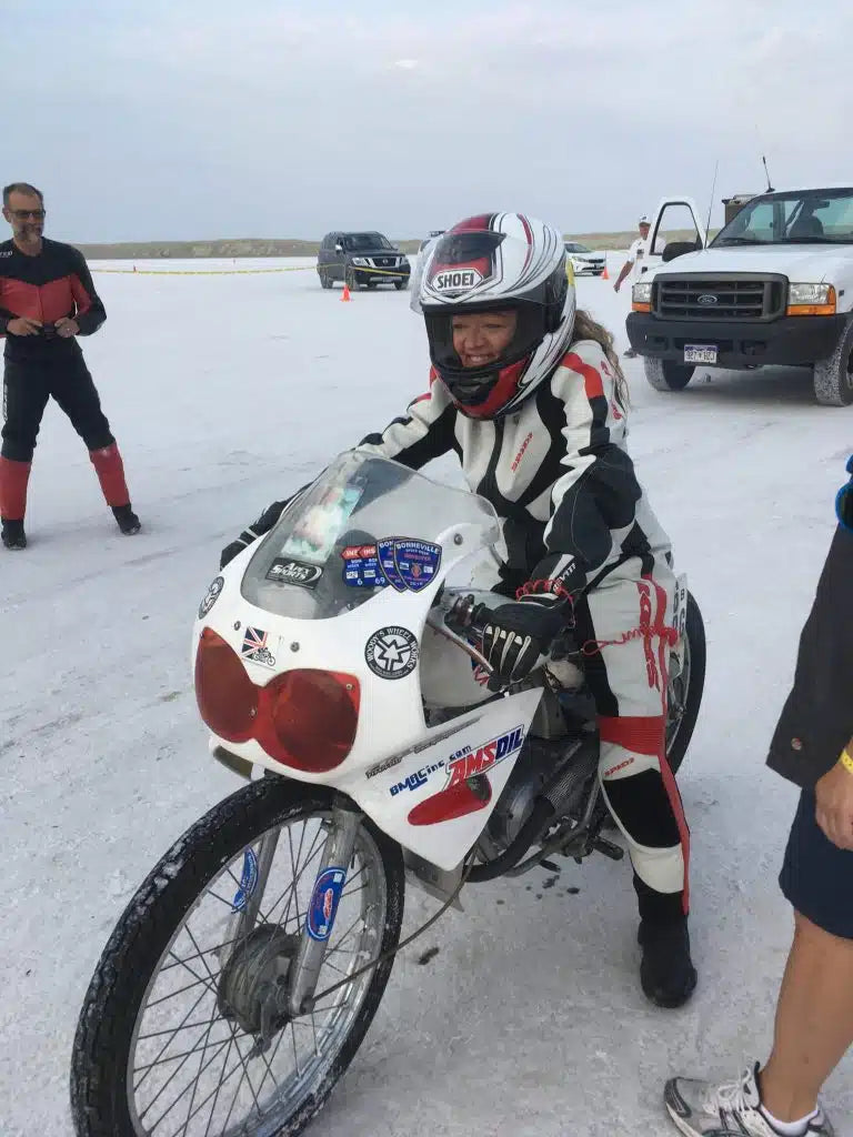 In August of 2018 I set a land speed record of 56 mph on a 1972 Honda 125cc. The old record was 52 mph. There’s no trophy, no award ceremony, just my name in the record book and a big old smile! Those moments, mere minutes on the salt when I was all alone on my run… hunkered down as tight as possible, thighs squeezing the tank, throttle hand steady, eyes taking in every grain of salt, heart beating in time with my motor, coiled but calm… the feeling is so hard to describe.